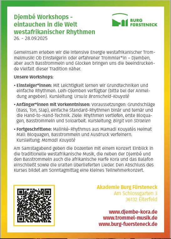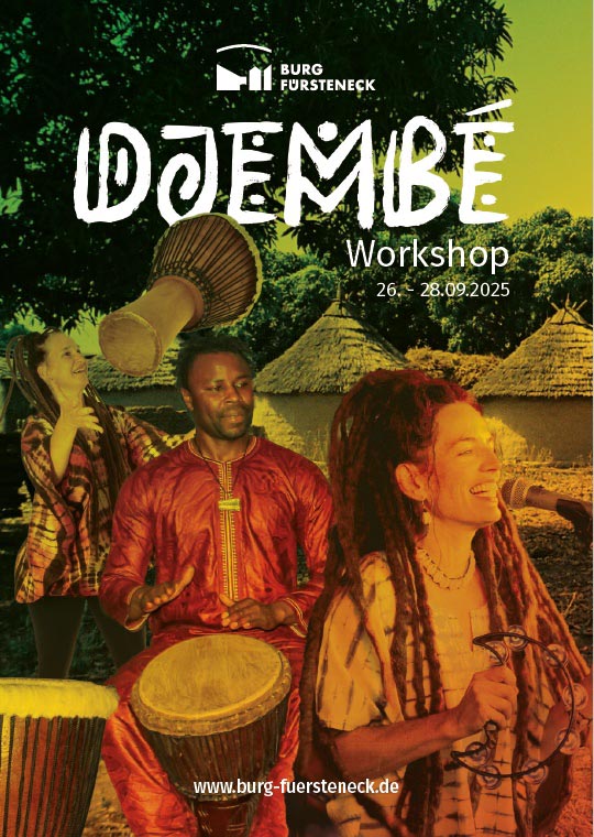 6 Djembé-Gruppen (Anfänger bis Profi), nachmittags afrikan. Tanz, Balafon, Kora, Improvisationskurse. Abends afrikan. Filme, Sessions, Abschlusskonzert, Dozentenkonzert, Überraschungsgäste, Afro-Disco.